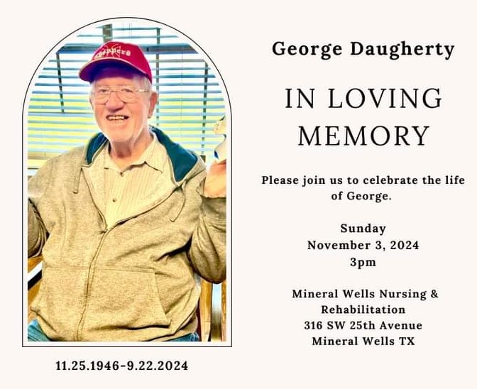 The service for George Washington Daugherty starts at 3 p.m. at Mineral Wells Nursing and Rehabilitation, 316 SW 25th Ave.