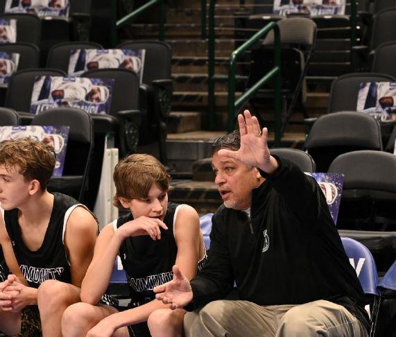 Warriors head coach Brian Rodricks shares a moment with Coalson Wise during the game against Chisolm Trail Photo Credit: Photo courtesy Cristy Wise Photography