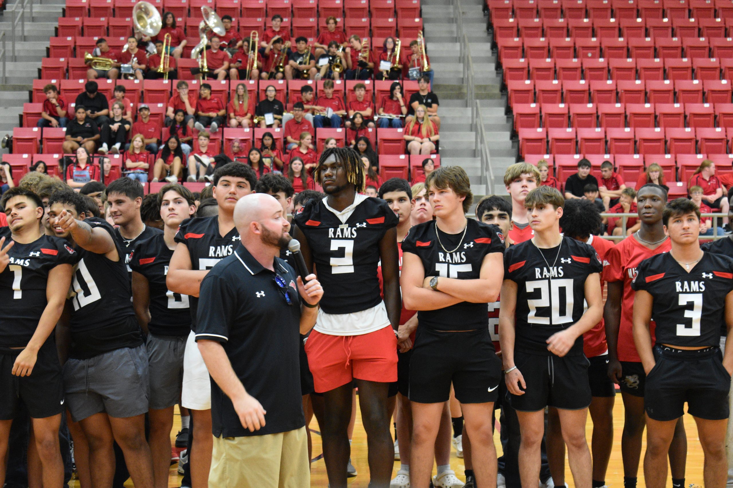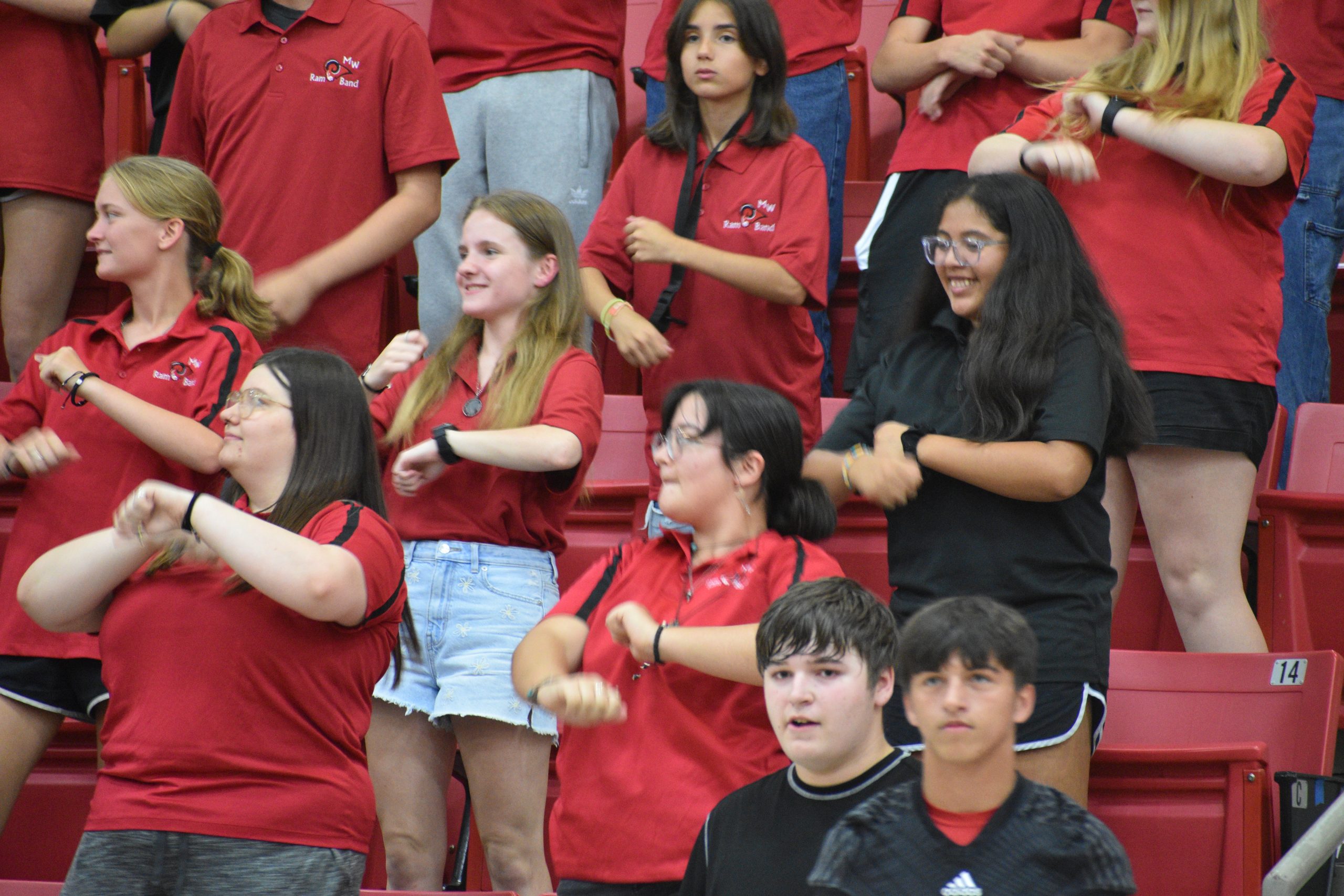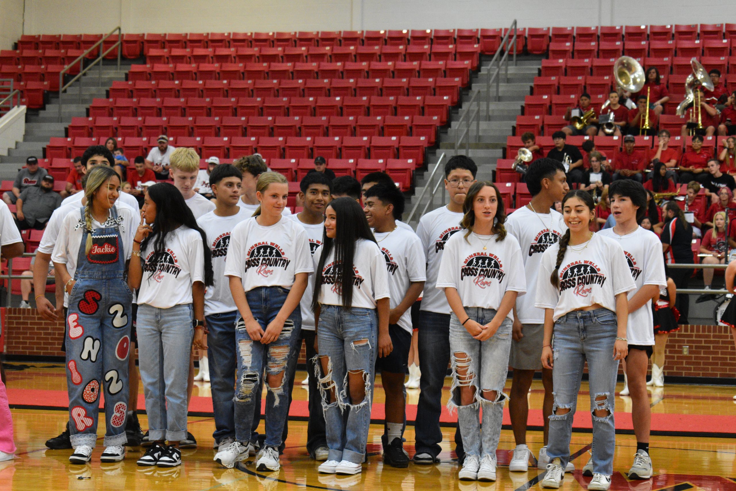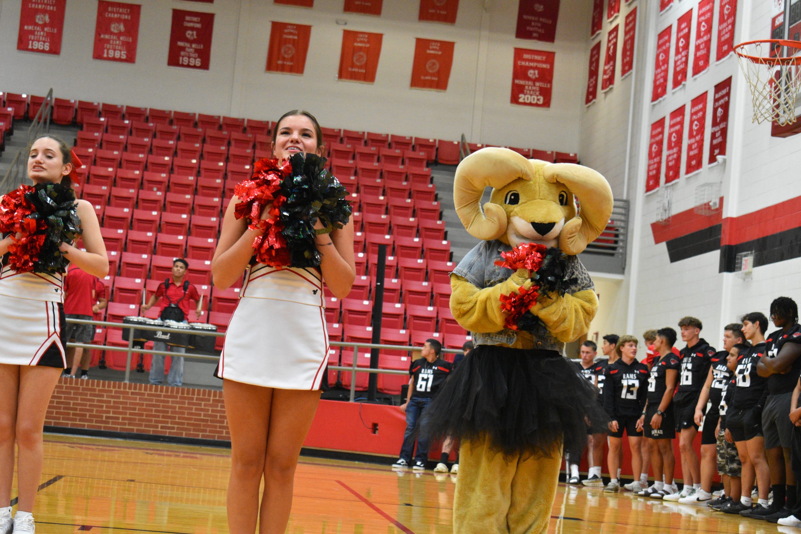Emceed by Rams coach, Jacob Kaspar, the band, Wranglerettes, and cheerleaders welcomed the five sports teams to the court to be recognized. Football, volleyball, cross country, golf, and tennis, alongside the student trainers all took the court while they were announced. Each teams head coach said a few words of encouragement and invited the community to watch them compete.