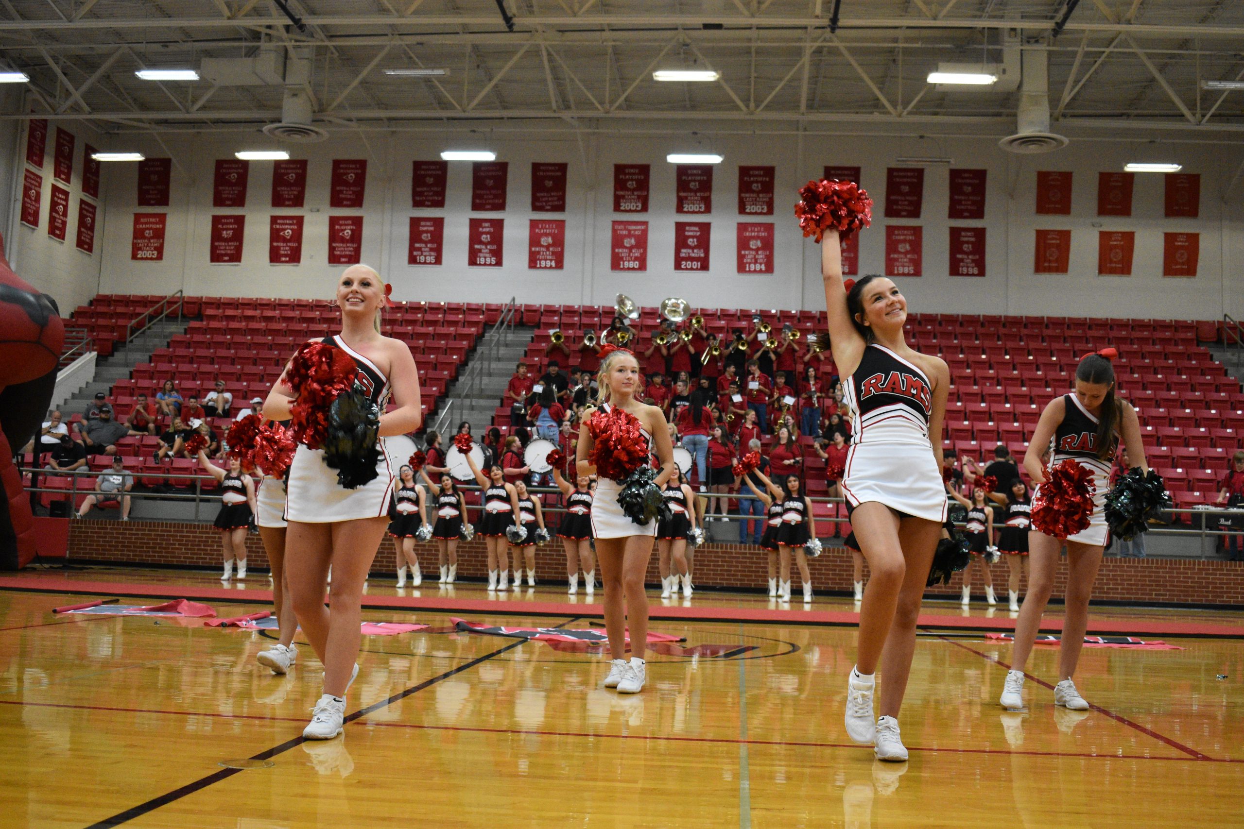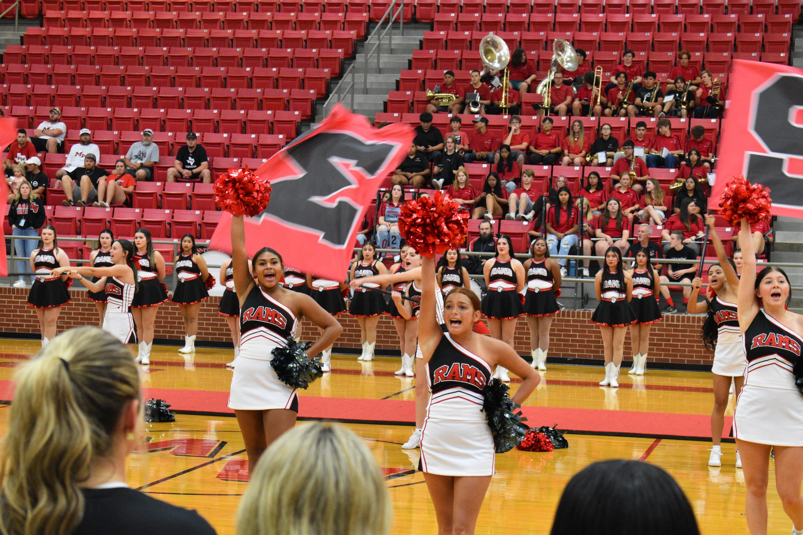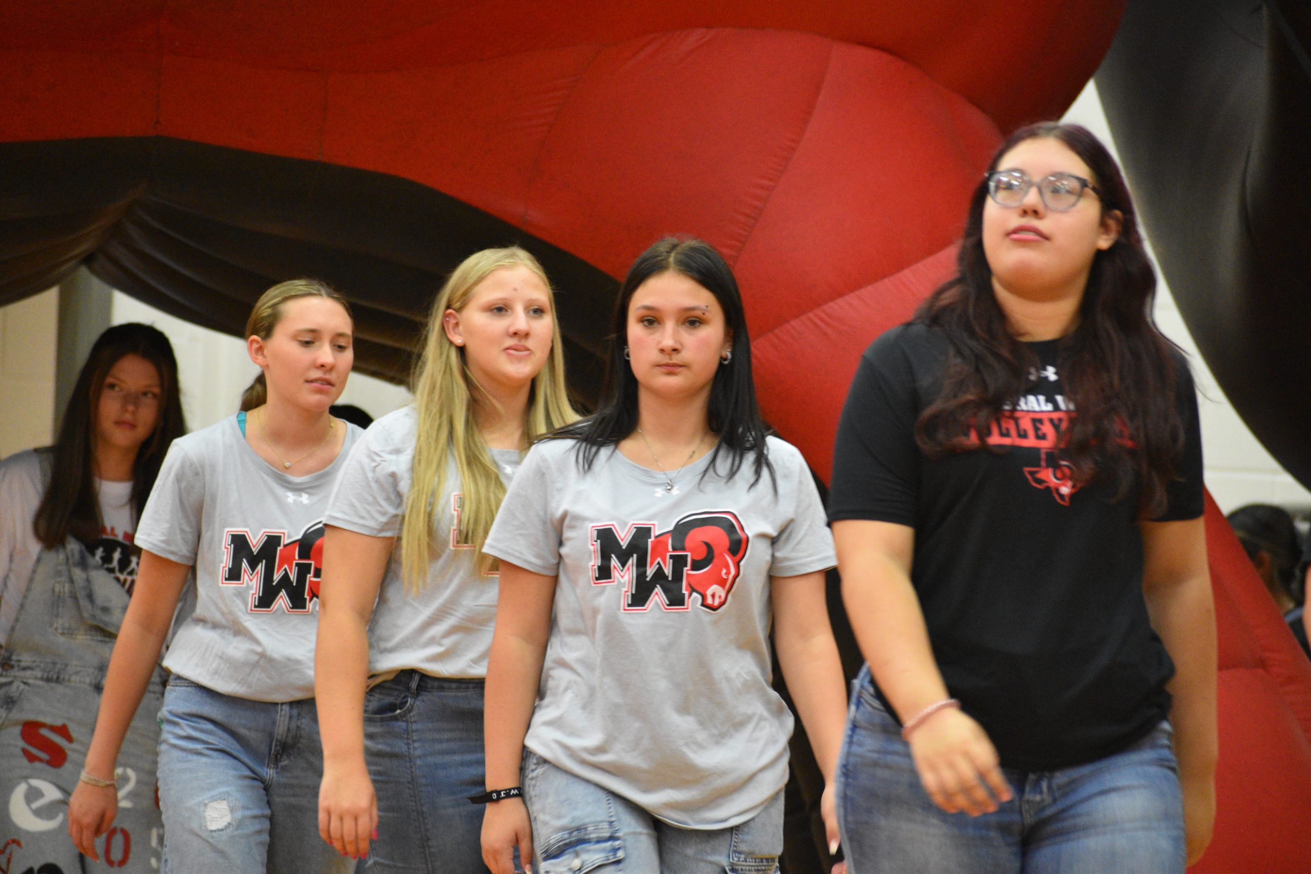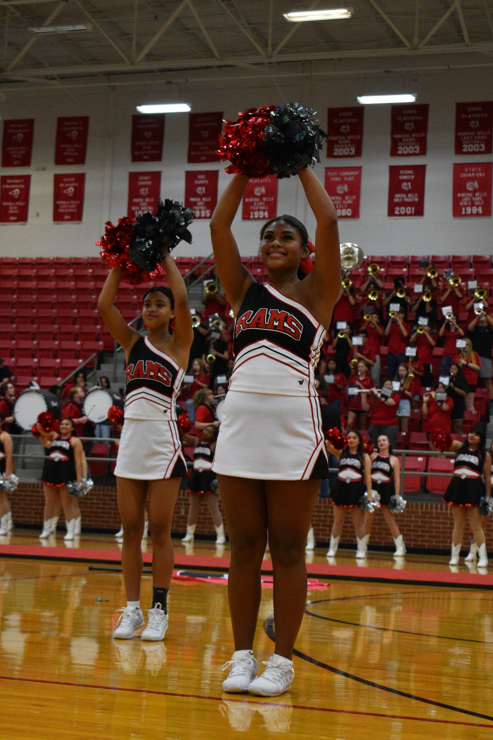 Emceed by Rams coach, Jacob Kaspar, the band, Wranglerettes, and cheerleaders welcomed the five sports teams to the court to be recognized. Football, volleyball, cross country, golf, and tennis, alongside the student trainers all took the court while they were announced. Each teams head coach said a few words of encouragement and invited the community to watch them compete.