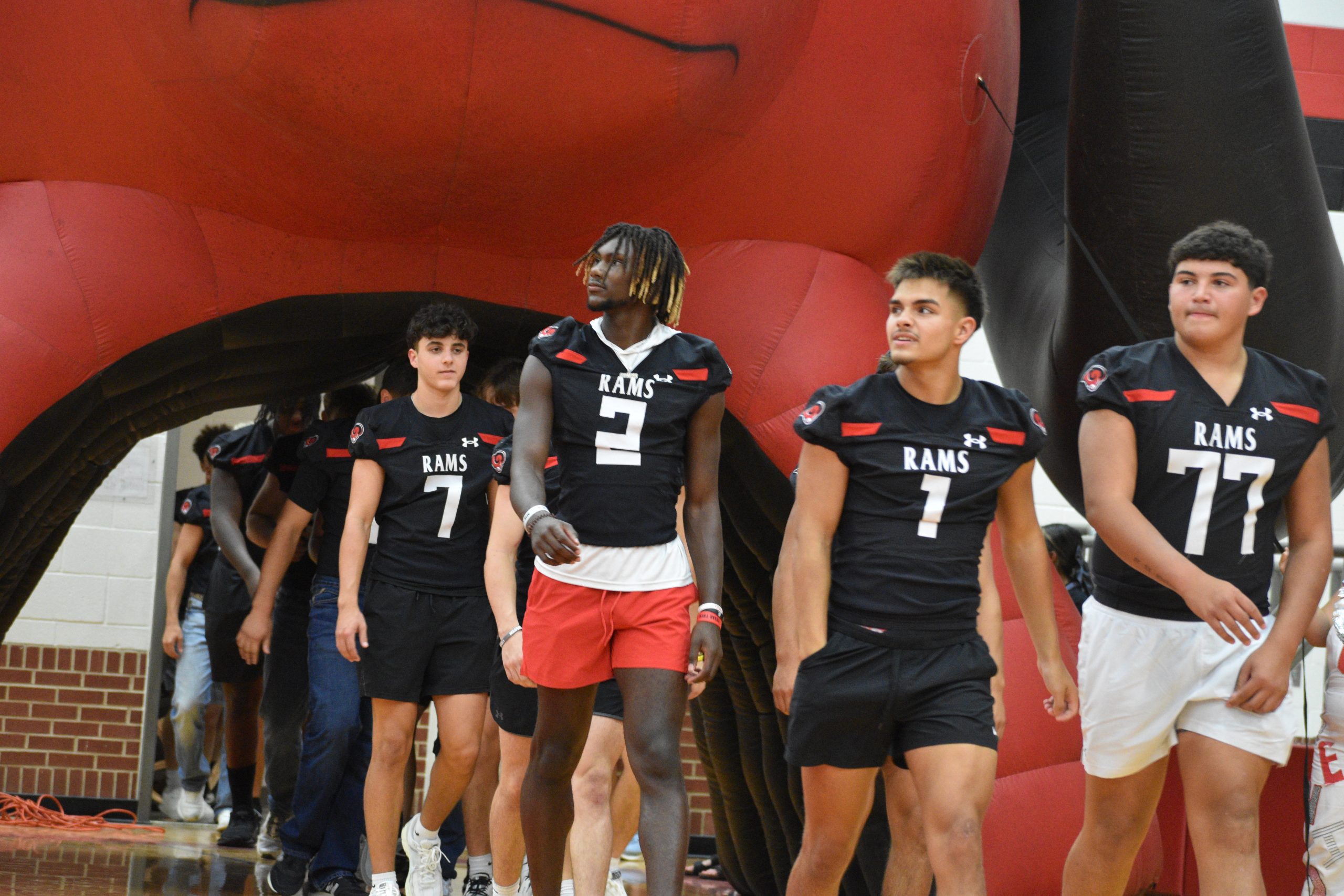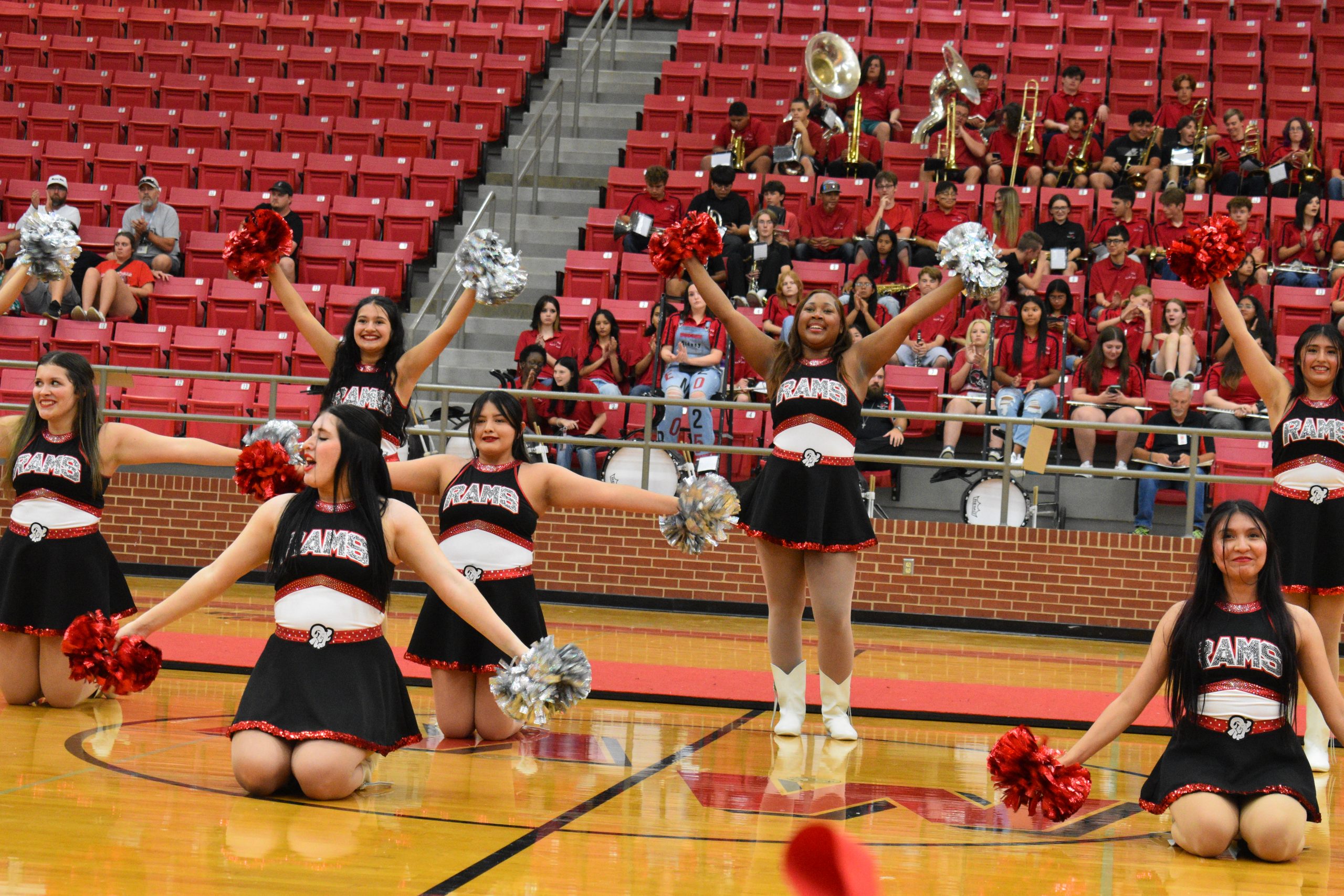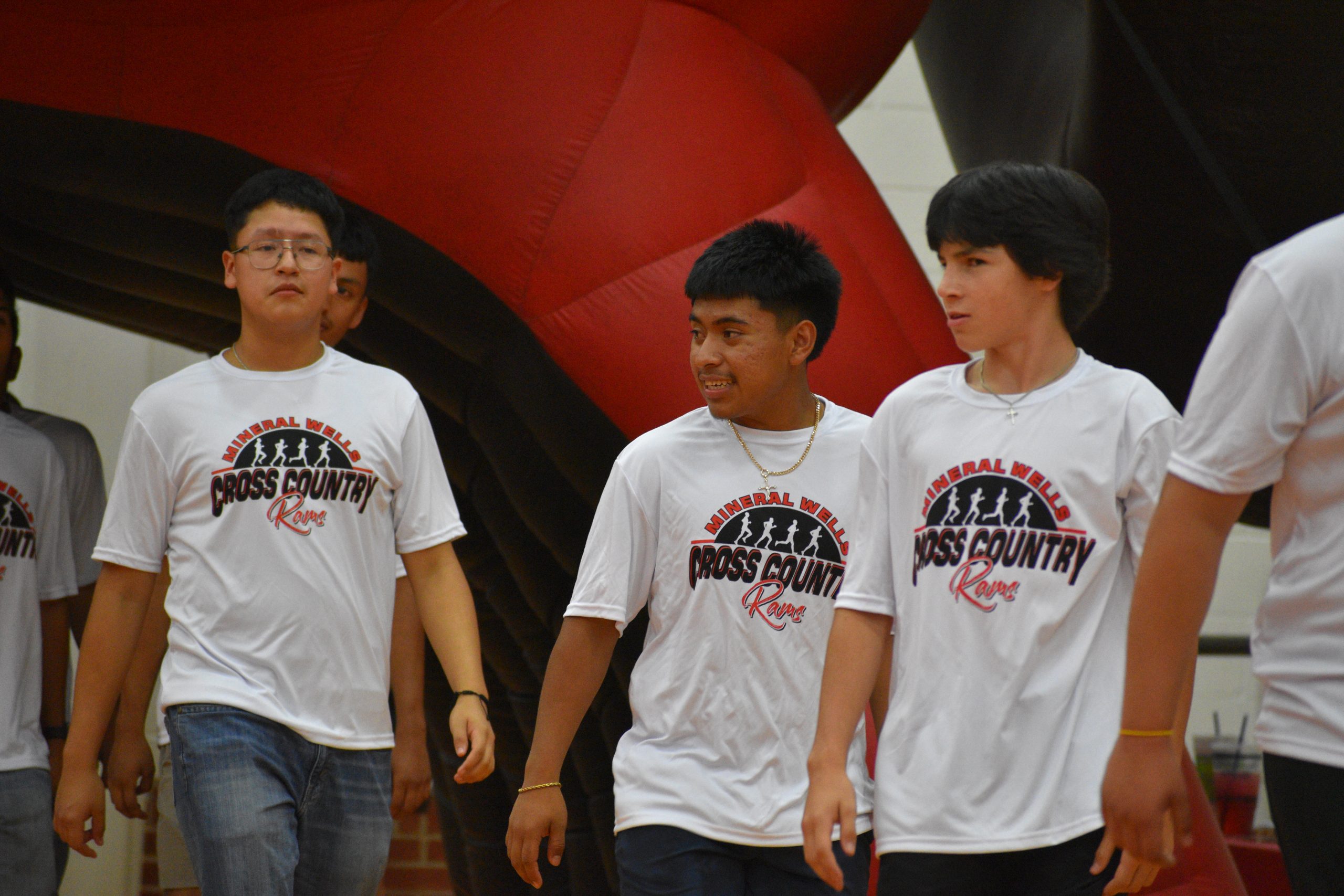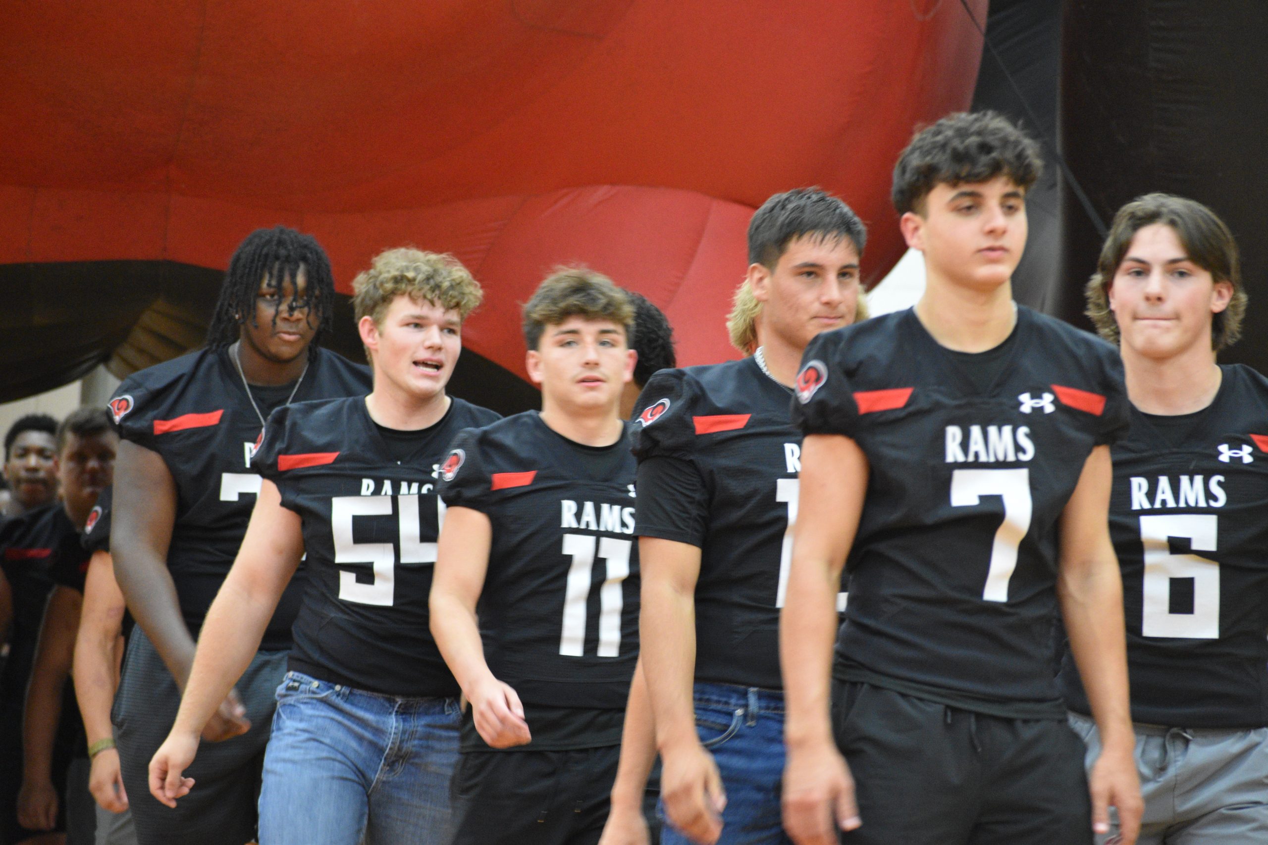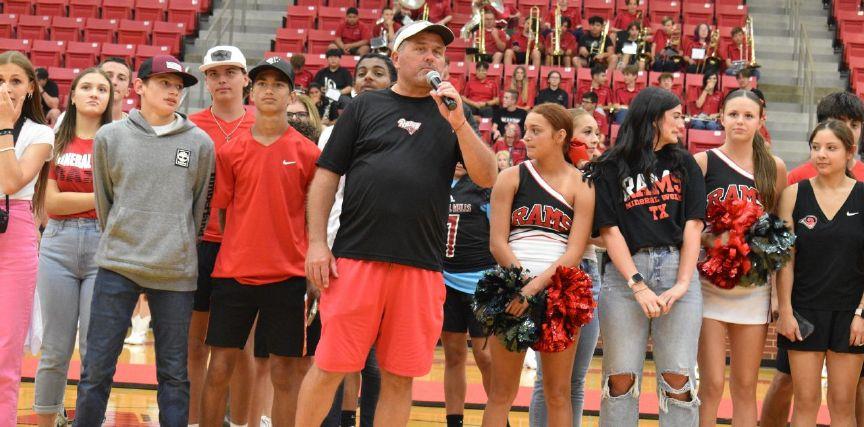Emceed by Rams coach, Jacob Kaspar, the band, Wranglerettes, and cheerleaders welcomed the five sports teams to the court to be recognized. Football, volleyball, cross country, golf, and tennis, alongside the student trainers all took the court while they were announced. Each teams head coach said a few words of encouragement and invited the community to watch them compete.