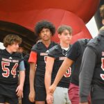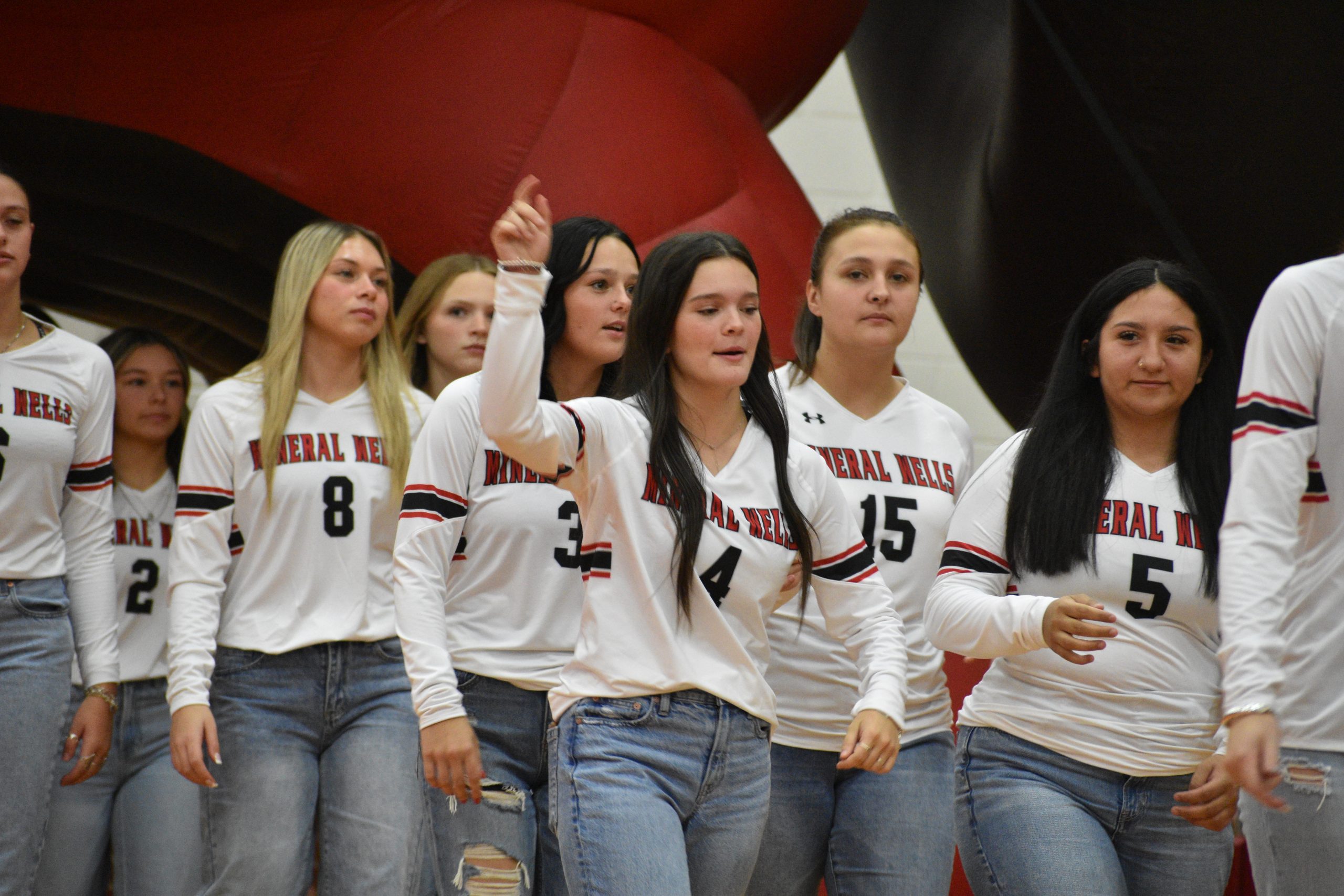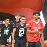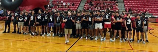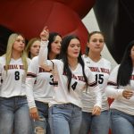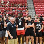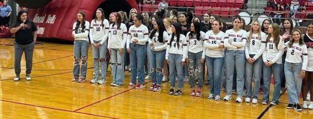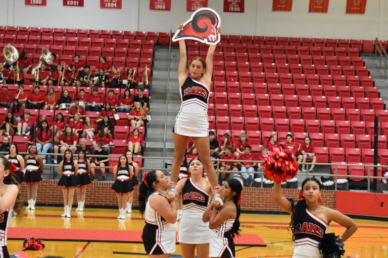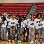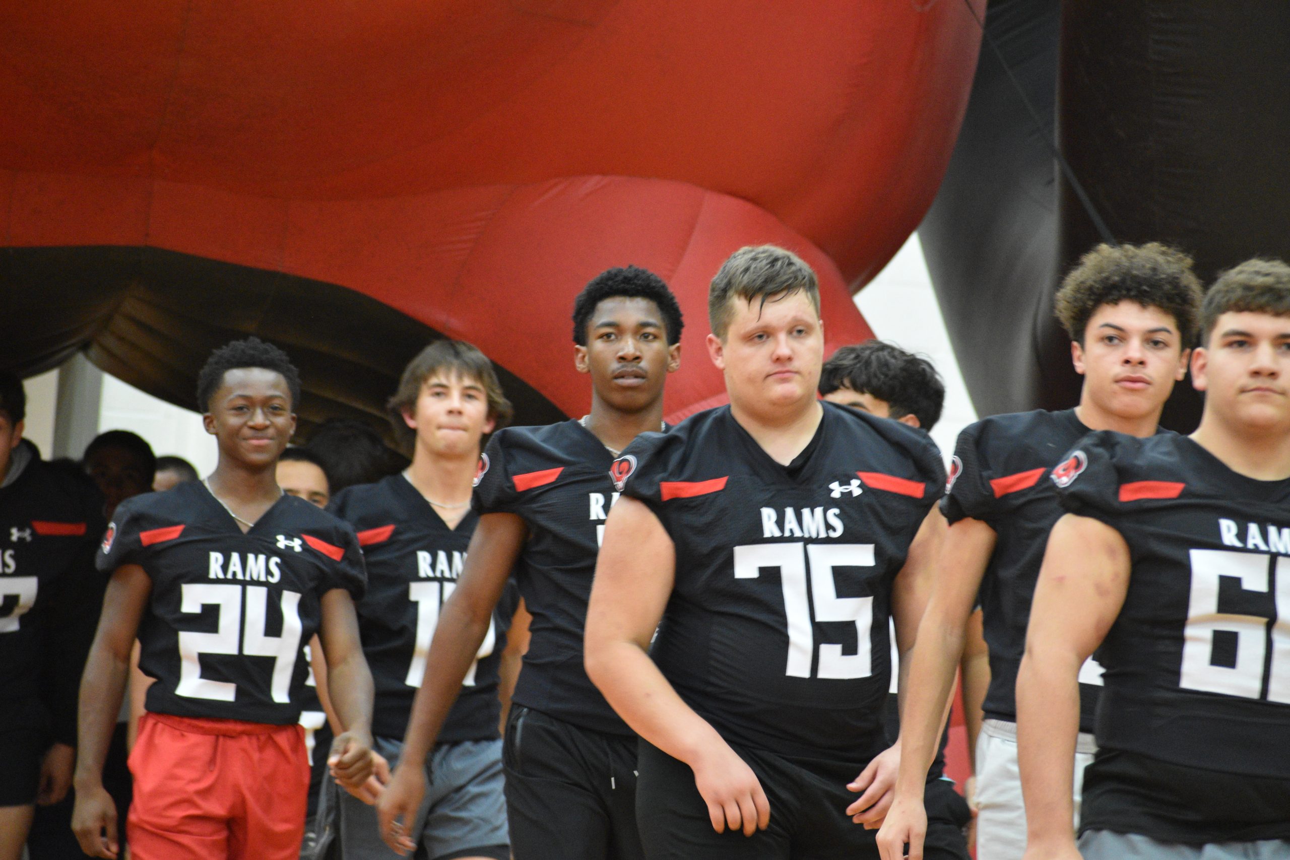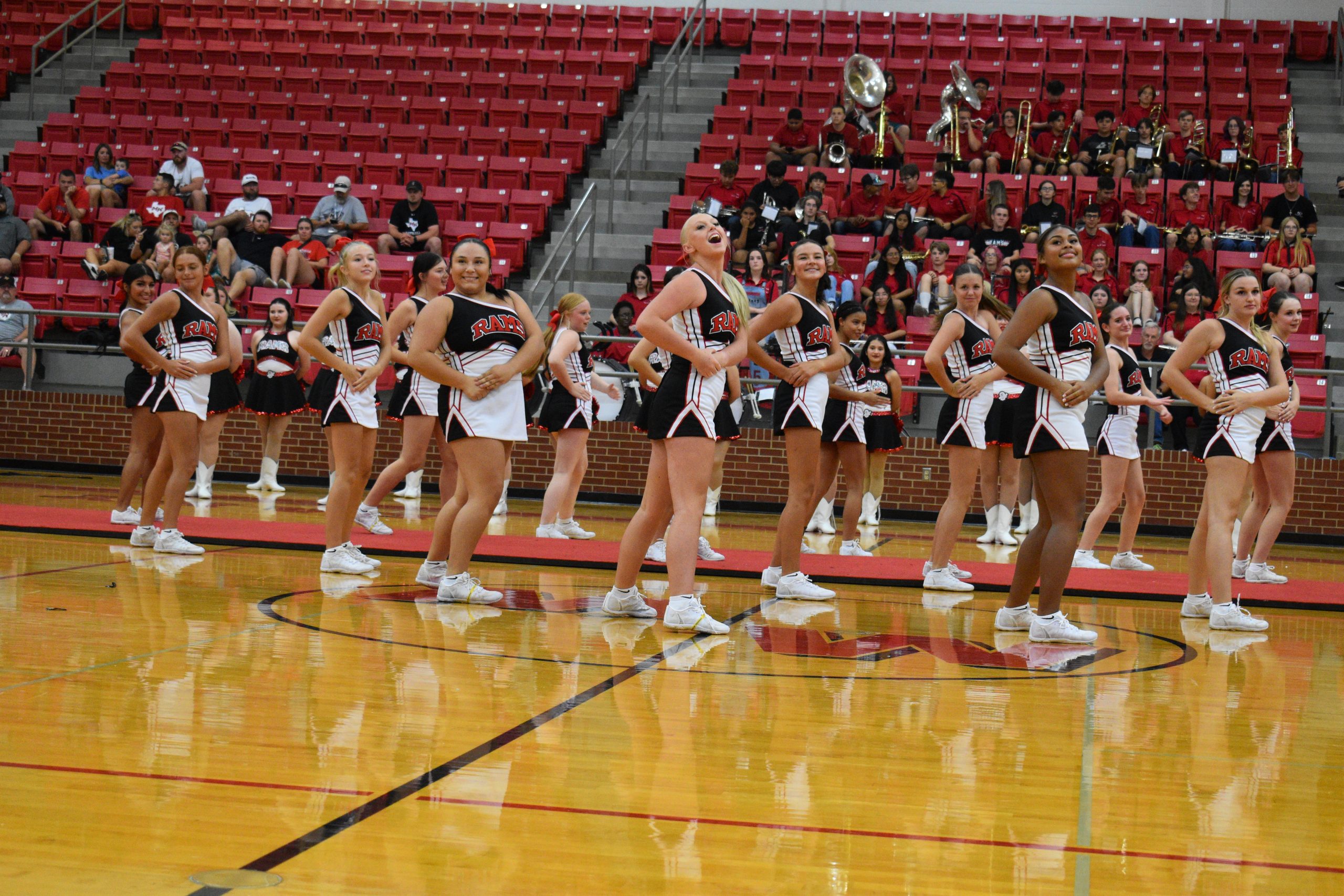 Emceed by Rams coach, Jacob Kaspar, the band, Wranglerettes, and cheerleaders welcomed the five sports teams to the court to be recognized. Football, volleyball, cross country, golf, and tennis, alongside the student trainers all took the court while they were announced. Each teams head coach said a few words of encouragement and invited the community to watch them compete.