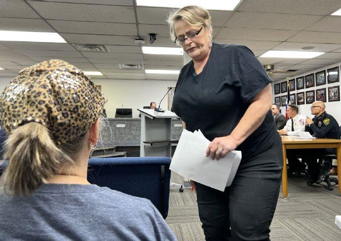 Recall petition organizer, Terri Glidewell, returns to her seat after the public comment portion of the Mineral Wells City Council meeting, Oct. 17. Ann Powers photo